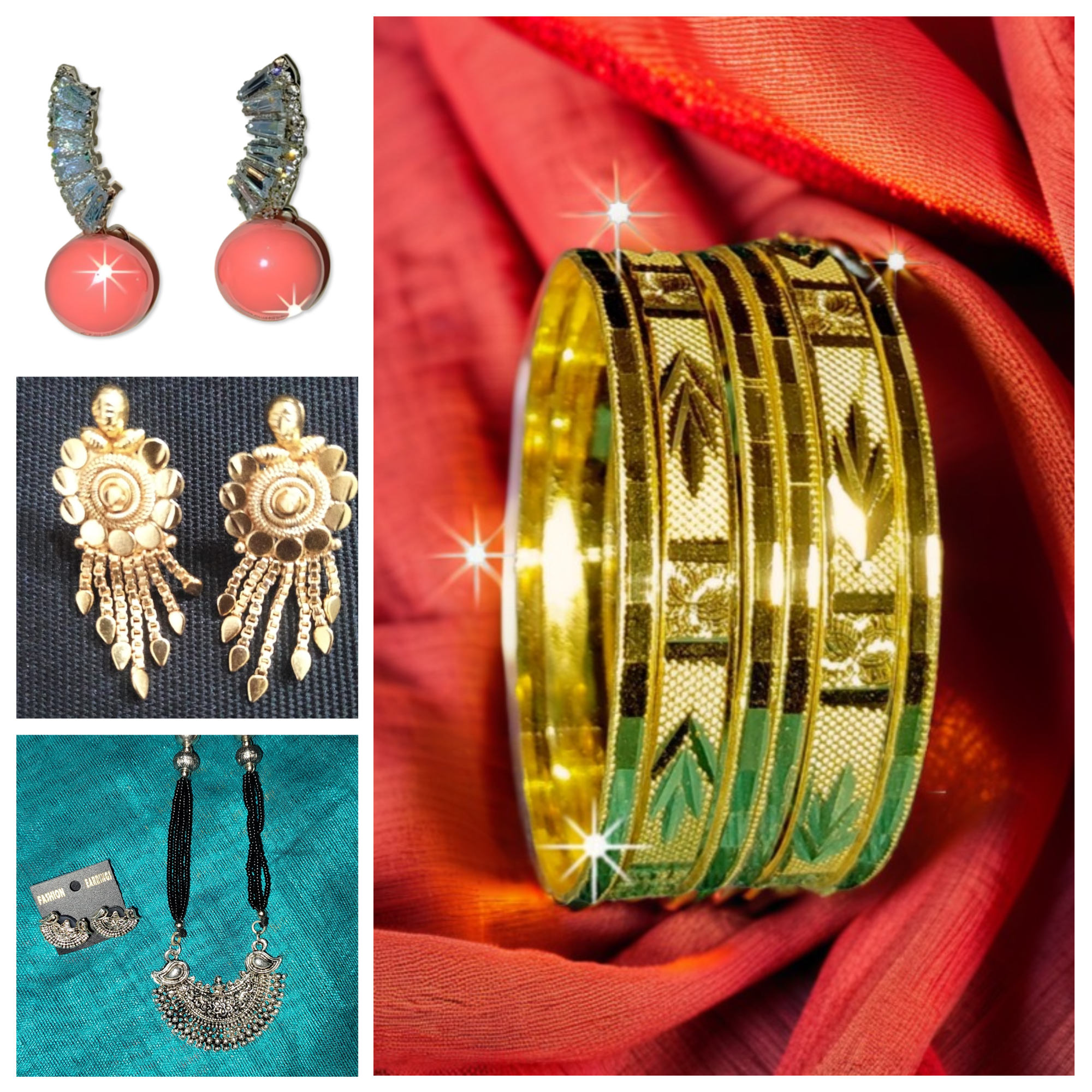 Elegant Artificial Jewelry Set Combo Pack – 5 Items Set of Bangles, Ear Tops & Silver Color Oxides Mangal Sutra, Oxides Air Tops, Pearl Style Ear Rings & Studs.